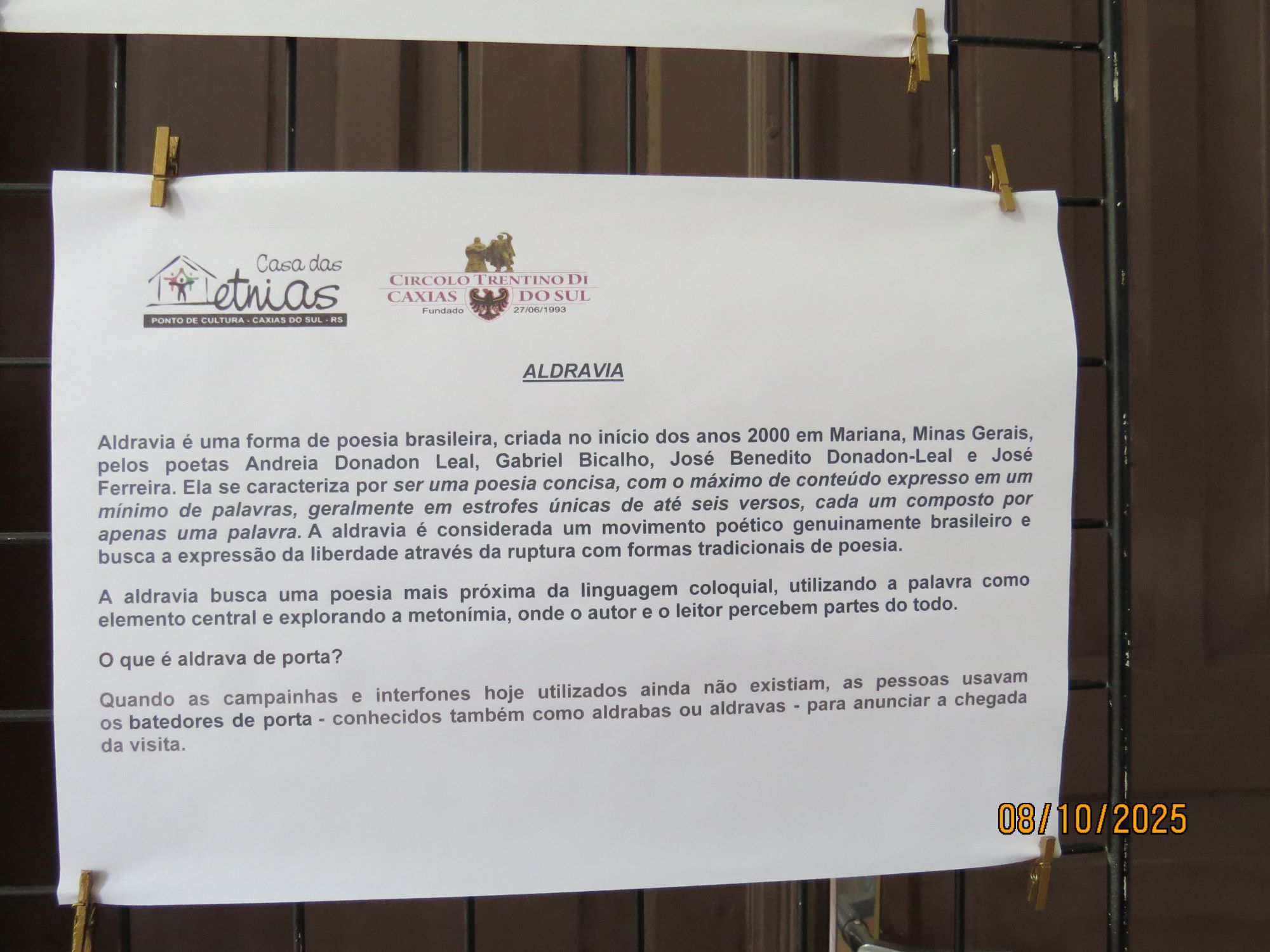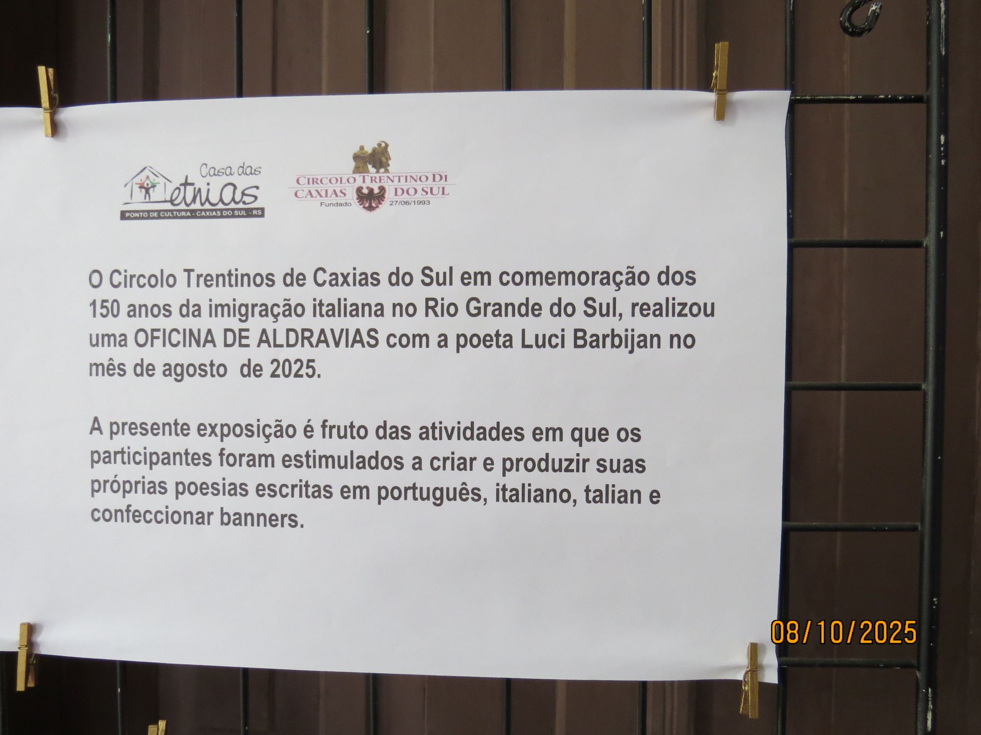 O Circolo Trentinos de Caxias do Sul em comemoração dos 150 anos da imigração italiana no Rio Grande do Sul, realizou uma OFICINA DE ALDRAVIAS com a poetisa Luci Barbijan no mês de agosto de 2025.